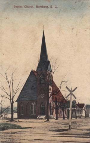 On November 3, 1872, Bamberg Baptist Church was founded. In August 1874, the church's inaugural building was constructed on West Church Street, next to the first Bamberg school building. The congregation's first pastor, Reverend J. F. Buist, began serving during this time. The church's charter members included J. A. J. Rice, J. W. Rice, R. F. Simmons, John J. Simmons, N. Z. Felder, E. M. Cox, Emma R. Buist, Sallie Cox, W. F. Connelly, Elizabeth Connelly, and Thomas Connelly. The establishment of a Sunday School followed in 1873.
