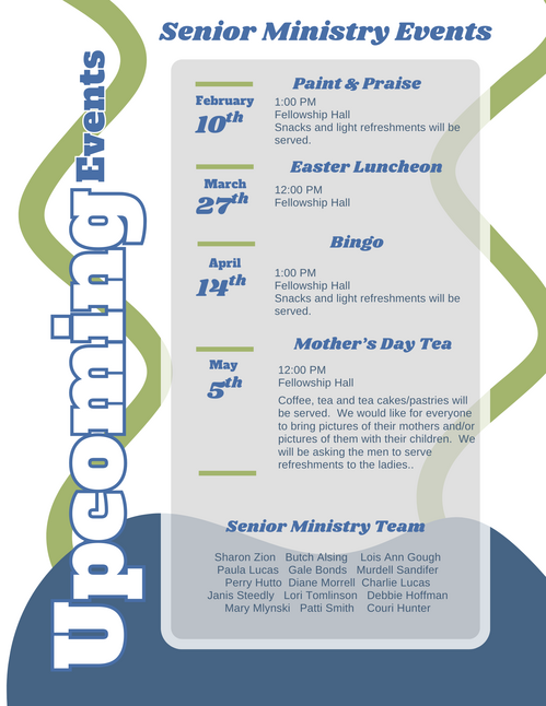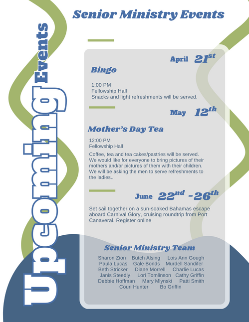 The Senior Adult Ministry Team exists to support and encourage the spiritual growth, fellowship, and well-being of senior adults (ages 65-95) at Bamberg FBC. In alignment with the church’s mission to love God (Look Up), serve the church (Look In), and reach the world with the gospel (Look Out), this team will engage seniors through various activities such as meals, trips, functions, and specific needs-based initiatives by providing opportunities for worship, discipleship, fellowship, and service tailored to the needs of senior adults. Through intentional ministry efforts, the team will ensure that senior adults remain actively engaged in the life of the church. Additionally, it will seek to foster relationships and offer pastoral care tailored to different stages of senior adulthood.